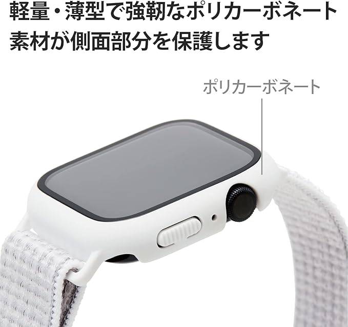 ケース部は、ポリカーボネート素材とガラスの2重構造で、Apple Watchの液晶部及び側面部を保護します。<br>
