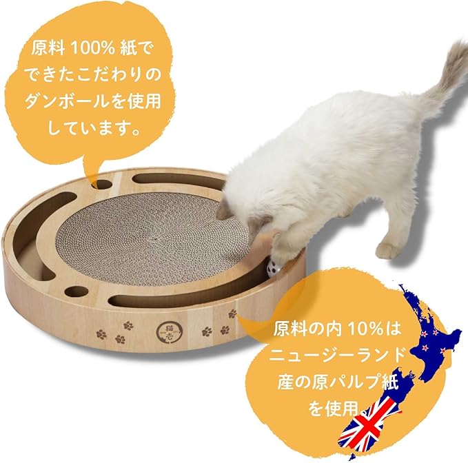 【猫壱の安心品質】バリバリボウルの原料は100%紙のダンボール。 猫ちゃんが毎日使う、猫ちゃんにとって欠かせない存在のつめとぎ、 そしてカラダが直接触れるものだから、品質にはとことんこだわり抜いています。 原料となる紙のうち、10%はニュージーランド産の原パルプ紙を使用しています。 品質の良いダンボールを使用しているので、つめとぎ後のとぎカスも少なくなっています。