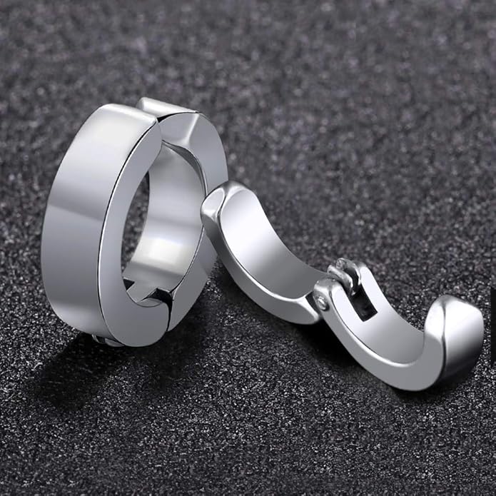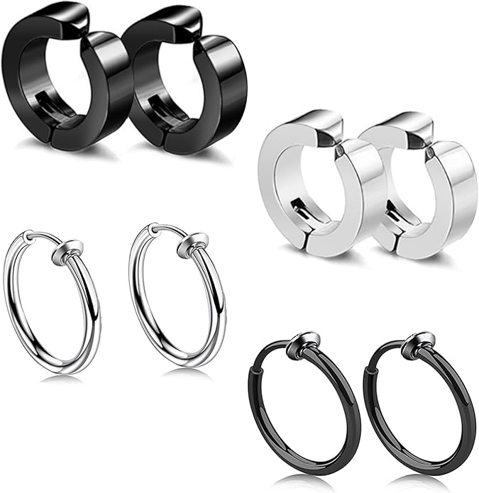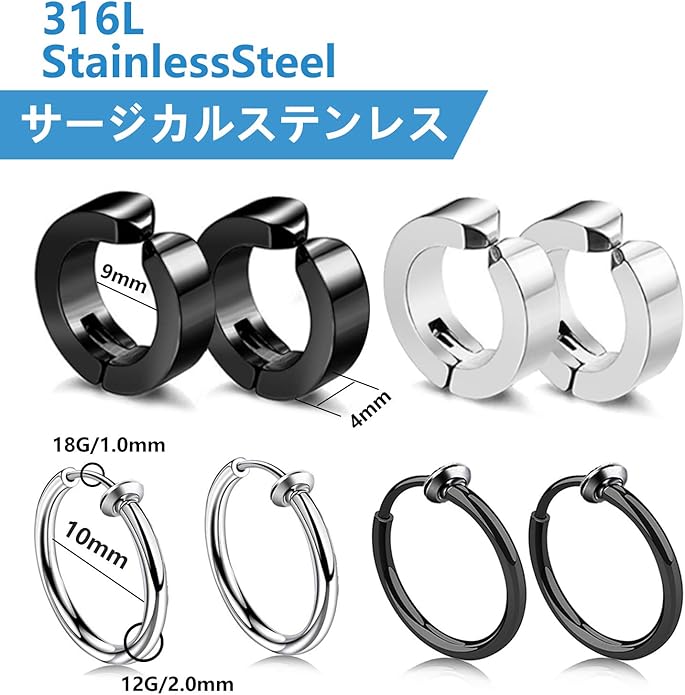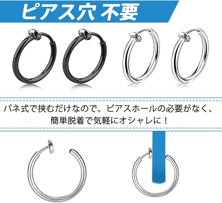 【お得な2色 イヤリング セット 】シルバー(4個)、ブラック(4個)(4ペア合計8個セットです!)人気の 両耳用 リング フープ ノンホール イヤリング デザインで。シングルピアスとして片耳だけにつけたり、両耳につけたりその日の気分で使い分けできます。カップルやお友達同士でシェアすると更にお得です!