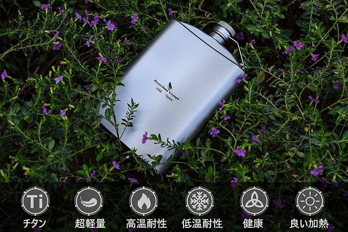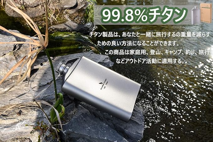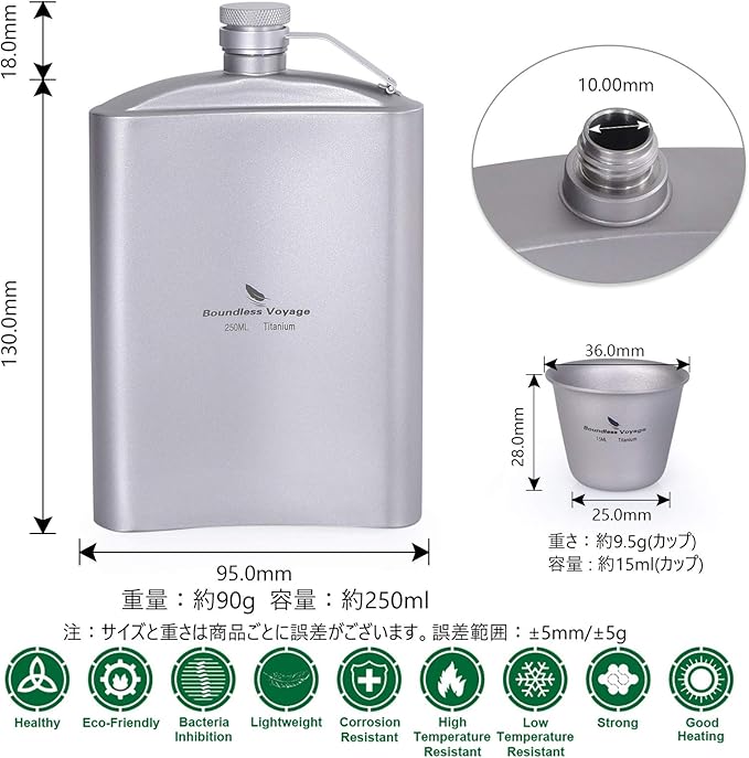 材質: 99.8%純チタン 、 容量:8.5oz/250ml(チタン製ヒップフラスコ) 、重量:約90g(チタン製ヒップフラスコ)、約9.5g(お猪口)。