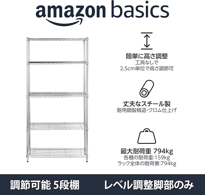 棚1枚当たりの耐荷重は159kg、棚合計で794kgと非常に丈夫な作りとなっております