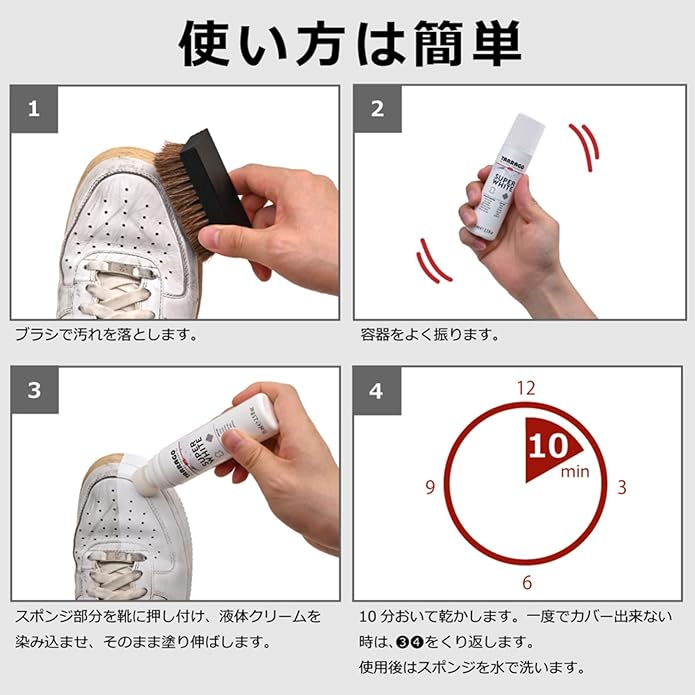 革 合成皮革 キャンバス などの素材に使用でき、スニーカーはもちろん、デッキシューズ ブーツ 上ばき などの家中のホワイトシューズを真っ白にします。