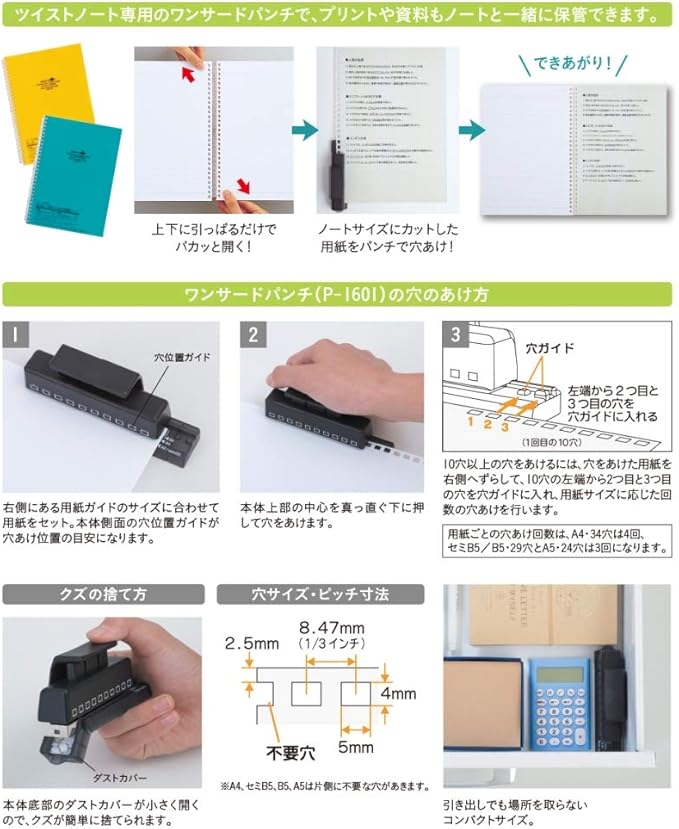 【用紙ごとの穴あけ回数】 A4・34穴:4回、セミB5/B5とA5・24穴:3回