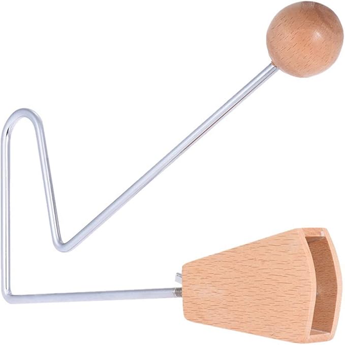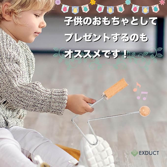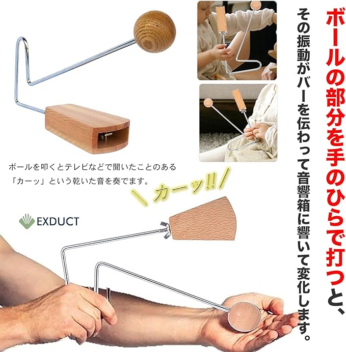 L字形の底部を片手で持ち、おもりを手にたたきつけたり打ち付けるだけで木箱を震えて音が出るので簡単に音を楽しむことができます。音がうまく出ない場合はネジ部分で締め付け具合や長さを調整することで音を調節できます。