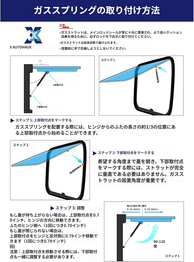 【ノート】設置前にリフトサポートを手で圧縮しないでください。ガスストラットは、正常に設置された後にのみ圧縮できます。取り付け後、蓋/カバーはスムーズに開閉します。使用温度:-25℃—70℃。