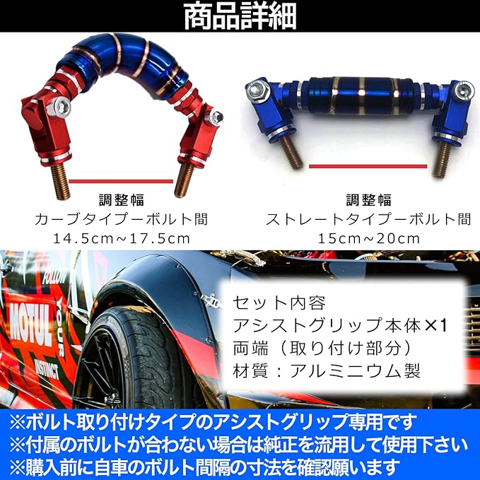 ボルト間調整幅: カーブタイプーボルト間14.5cm~17.5cm ストレートタイプーボルト間15cm~20cm ステー部分でボルト間の幅を調整可能。様々な車種に取り付け出来ます。また、ステー部分は3種類のカラーバリエーションから選択出来ます