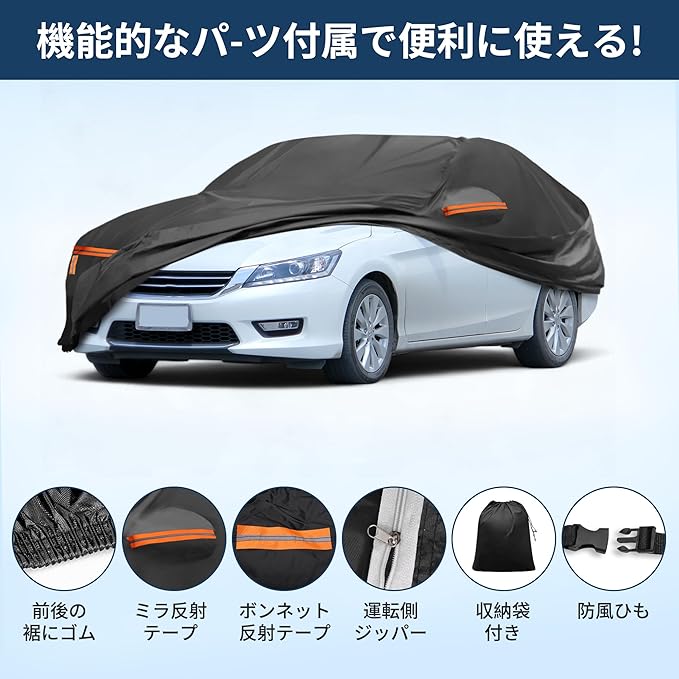 【優れたデザイン】7個の反射警告テープ:夜間に光を放つ蛍光オレンジ色で設計されており、周囲の視認性を高め、予期せぬ衝突を効果的に回避します。安全性を重視したデザインです。運転席側ジッパー:便利な運転席側のジッパーにより、いつでも簡単にアクセス可能。車内の小物を取り出したり、運転席への出入りがスムーズです。 風を防ぐストラップ:強風時でも安心な風を防ぐストラップが付いており、車体をしっかりと固定。伸縮性のある裾デザインで、どんな天候でもしっかりとフィットします。