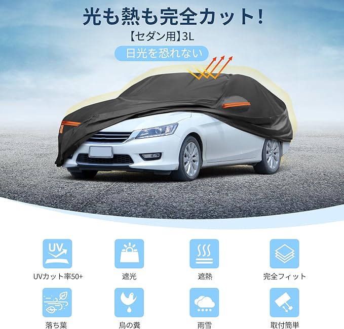 【耐久性】愛車のボディをしっかりとガードします。駐車時の雨や鳥の糞、霧、ホコリ、大気中のガスなどから、効果的に保護します。梅雨の湿気や酸性雨による車体の劣化を防ぎ、直射日光からの紫外線による塗装の変色や、太陽光によるダッシュボードの変形を防止します。カバーは耐久性に優れ、清掃も簡単です。