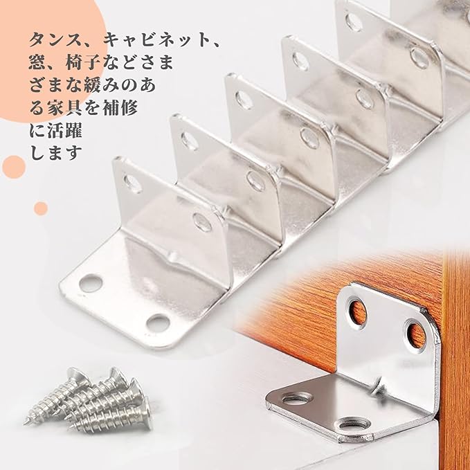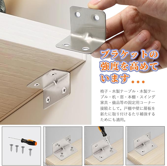 【多機能】ブラケットの強度を高めています。タンス、キャビネット、窓、椅子などさまざまな緩みのある家具を補修に活躍します。戸棚や壁に層板を新たに取り付けるたり補強するためにも適用。