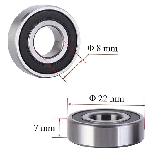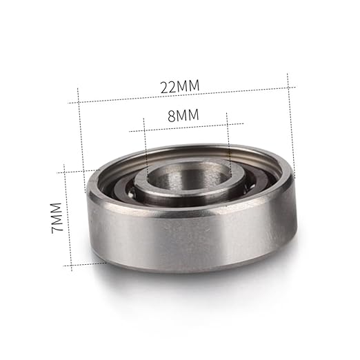 スケート靴--- ボア (d): 8.000 mm。外側 (d): 22.000 mm。幅 (b): 7.000 mm。半径(最小)( ):0.30 mm。動定格荷重 ( ): 2.53 kn。静定格荷重( ):1.36kn。最高速度 (グリース): 26,000 。最高速度 (オイル): 34,000 。