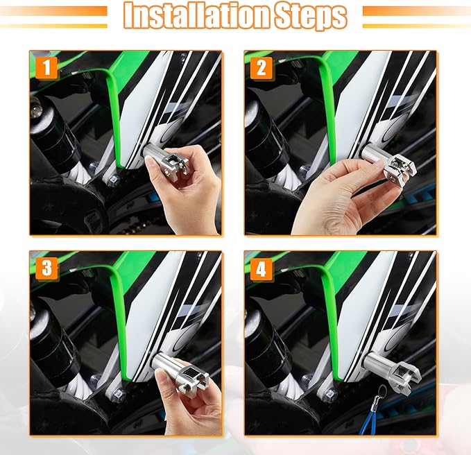 [簡単な取り付け] フットペグサポートを車両に取り付けます。ネジをフットペグサポートからフレームのネジ穴に取り付けます。ネジに締め付けます。穴の内側にスプリングワッシャーを置きます。穴にペグを入れます。ピンを取り付け、マウント、ペグ、スプリングワッシャーの穴を通します。スナップリングプライヤーを使用してスナップリングをピンに固定します。または、インターネットで取り付け動画を見つけることもできます。