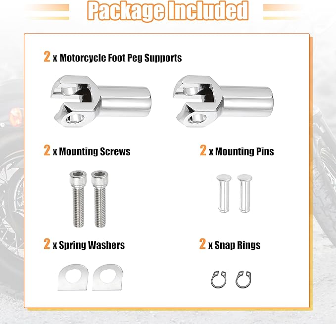 [パッケージに含まれるもの] モーターサイクルフットペグサポート2個;取り付け用ネジ2本;取り付け用ピン2本;スプリングワッシャー2個;スナップリング2個