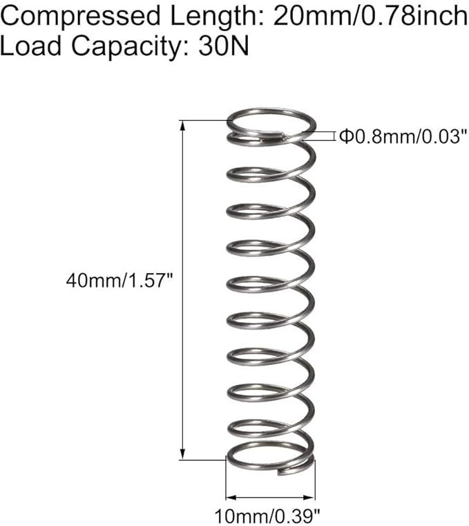 仕様:20mm / 0.78インチの圧縮長さ、30Nの耐荷重、2 N / mmのばね定数。