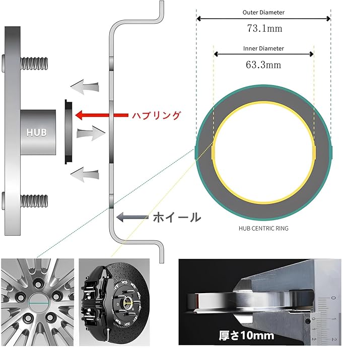 【サイズ】外径73.1mm、内径63.3mm、厚さ10mm、●材質: アルミ製、●セット内容:4個入り(1台分)。ご購入前に必要なホイールの直径をご確認ください、適合しない場合は取り付けできない場合があります。