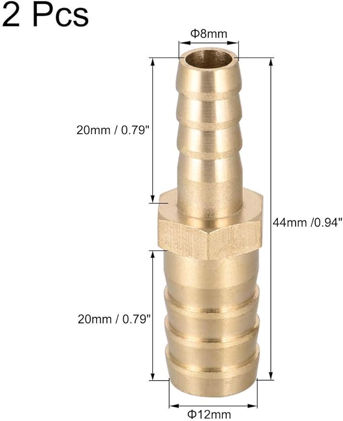 バーブ径:12mmから8mm(1 /2"から3 /8");全長:44mm /0.94";六角幅:13mm /0.51";バーブの長さ(約):20mm /0.79"
