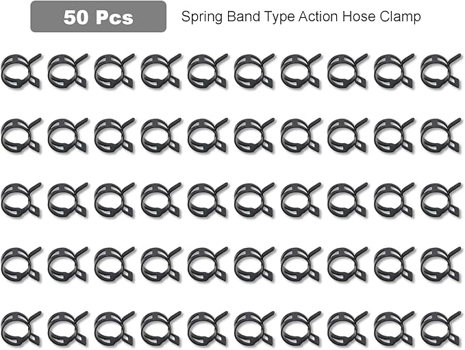 サイズと数量:スプリングバンドホースクランプは、内径12mm、フィッティングホースの外径12.5 - 13.2mmの完璧なサイズです。 各パッケージには 50 ユニットが含まれており、さまざまなニーズに十分な供給を提供します。