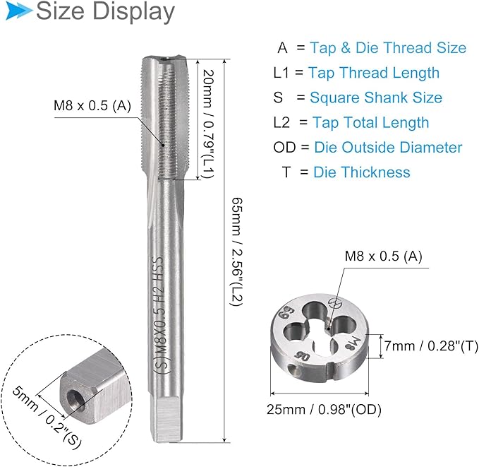 ★ タップとダイセットのサイズ --- タップ & ダイねじサイズ:M8 x 0.5; タッピング方向:右側; タップ精度:H2; スクエアシャンクサイズ:5mm; タップねじ長さ:20mm; タップ全長:65mm; ダイ外径:25mm; ダイ厚さ:7mm