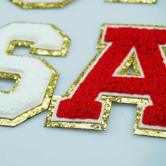 【貼り付け簡単シェニール文字ワッペン】金色の縁が光の中で輝きます。 裏面のフィルムは接着剤ですので、剥がさないでください。 針と糸で縫うことで、よりしっかりとくっつくことができます。