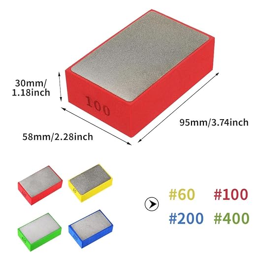 パッケージ&サイズ: パッケージには60#1個、100#1個、200#1個、400#ダイヤモンド研磨パッド1個が含まれます。 サイズ:95*58*30mm / 3.74*2.28*1.18インチ(長さ*幅*高さ)。ダイヤモンド研磨パッドについてご質問がある場合は、速やかにご連絡ください。