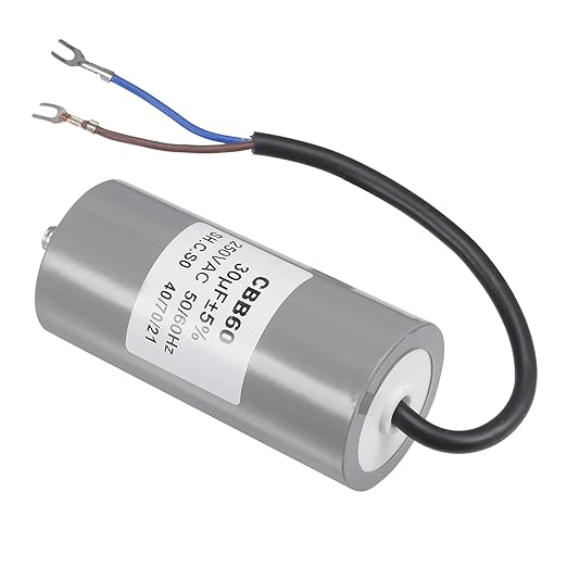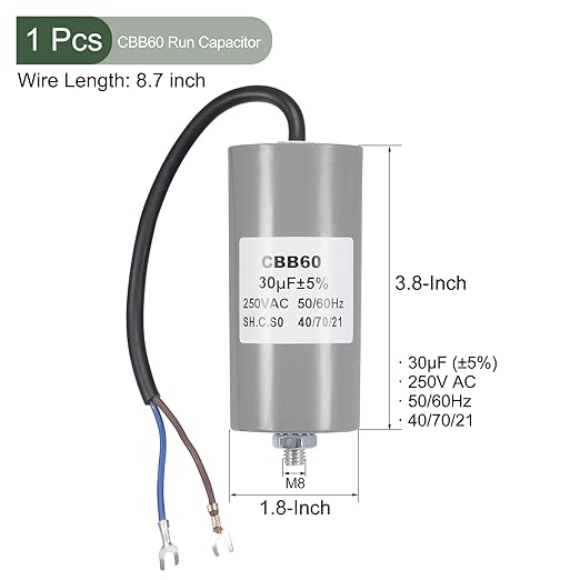 √商品内容 - パッケージには、ナットと歯付きガスケット付きのCBB60ランコンデンサ1個が付属します。ねじ: M8、固定スタッドの長さ: 13 mm、ワイヤの長さ: 220mm、ボディサイズ: 96x46mm (L*D)、リードエンド: 2。 フォーク端子付きワイヤー、公差: 5%、定格容量: 30uF、定格電圧: 250V AC、定格周波数: 50/60Hz、気候カテゴリ: 40/70/21。