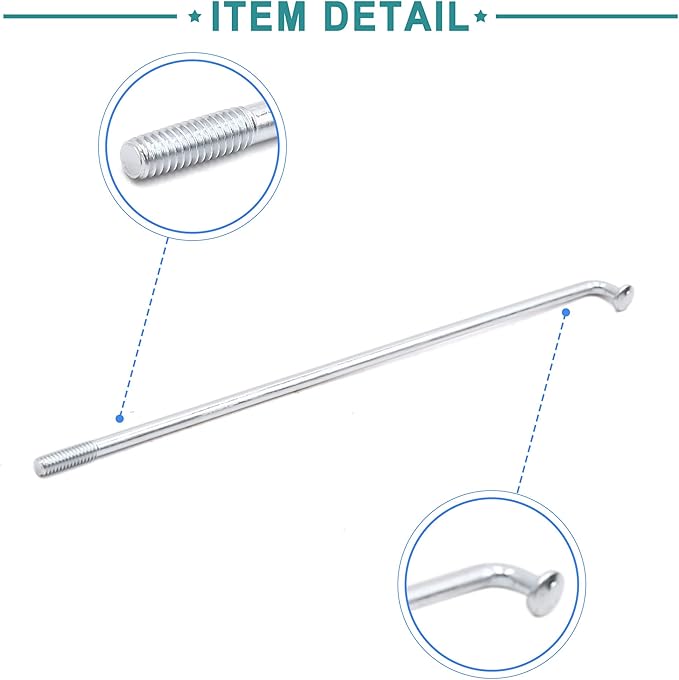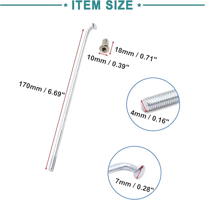 サイズ - ネジサイズ:M4X0.8、肘ヘッド直径:7mm、スポークネジ直径:4mm、スポークの長さ (肘なし):170mm、ニップルサイズ:18 x 10mm(L*最大.D)