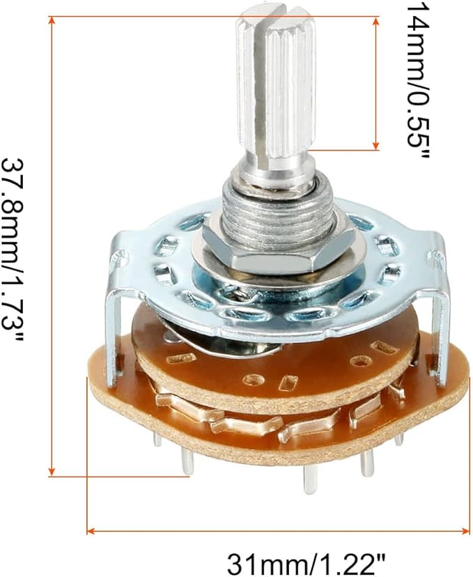 2-[サイズ]: コンタクトタイプ:2極 6スロー、1デッキ; ピン数:14; 適合取付穴径:9mm; 回転シャフト径: 6mm; シャフトの長さ: 14mm