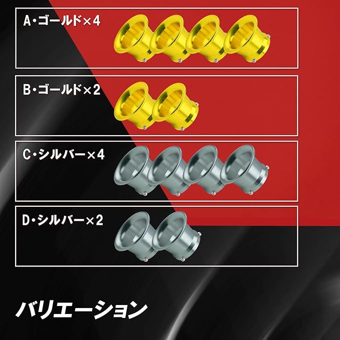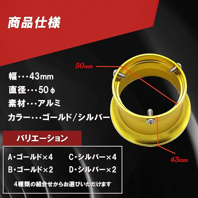 カラーはゴールドとシルバーの2種類をご用意。カラーバリエーションがあり、用途やカスタムのスタイルに合わせて選択できます。サイズは直径50mm、幅43mmで、多くのキャブレターに対応可能ですが、事前に形状や適合サイズをご確認ください。